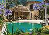 Through the entrance doors, the first glimpse of the pool tiled a dark sapphire and beyond, the verdant gardens and thatched gazebo, will take your breath away!